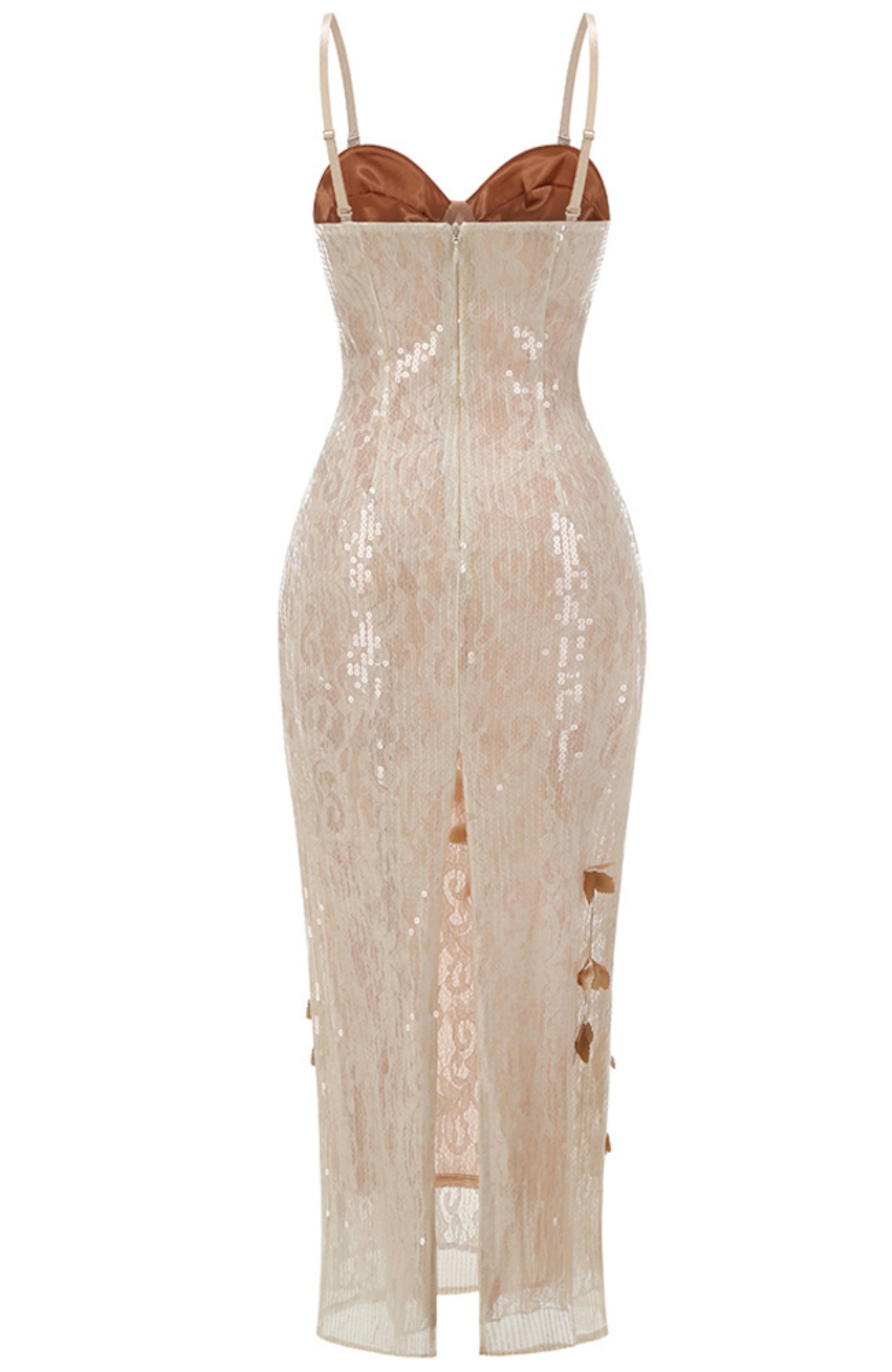Aitland Leaf Detail Bustier Sequin Lace Maxi Dress In Brown Nude