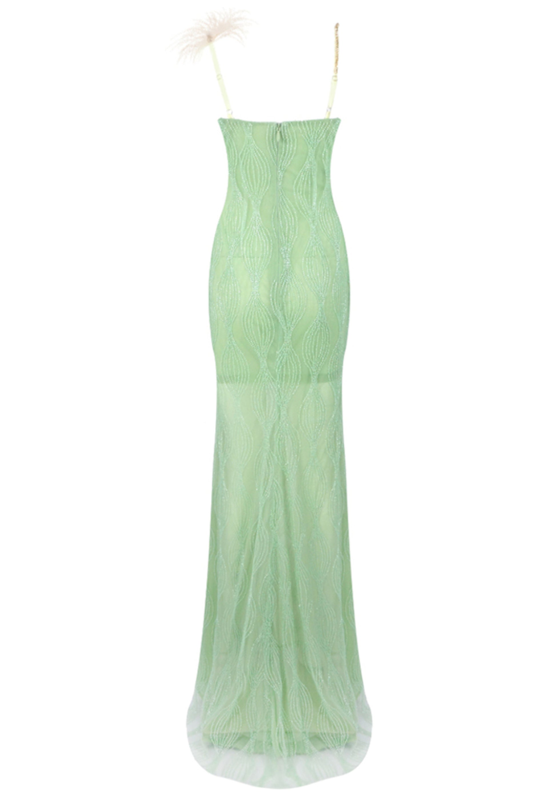 Jaslene Feather Detail Maxi Dress Green In Gold
