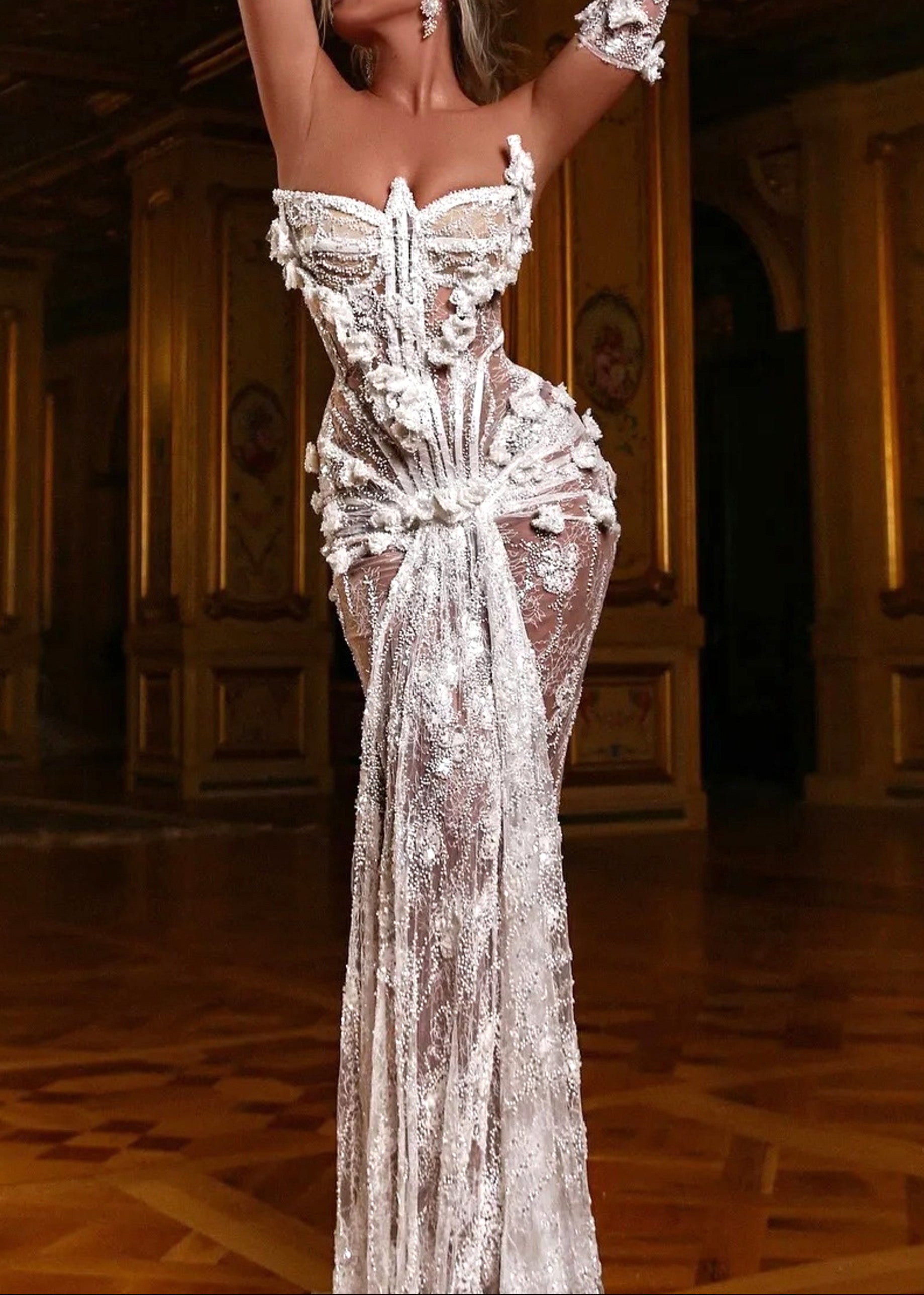 Kexar Strapless Pearl Sequin Lace Corset Maxi Dress In White