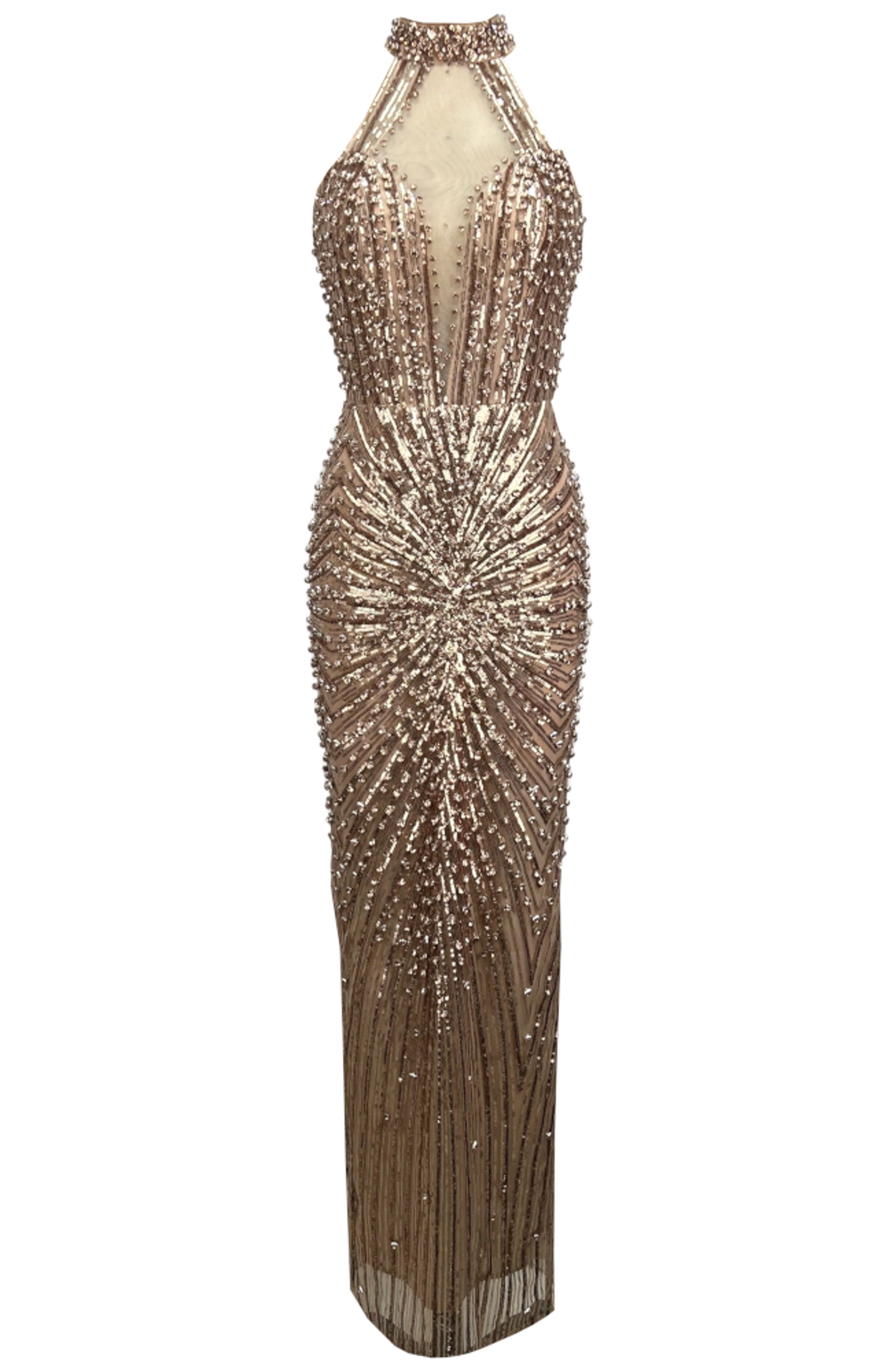 Ogima Halter Crystal Sequin Maxi Dress In Gold
