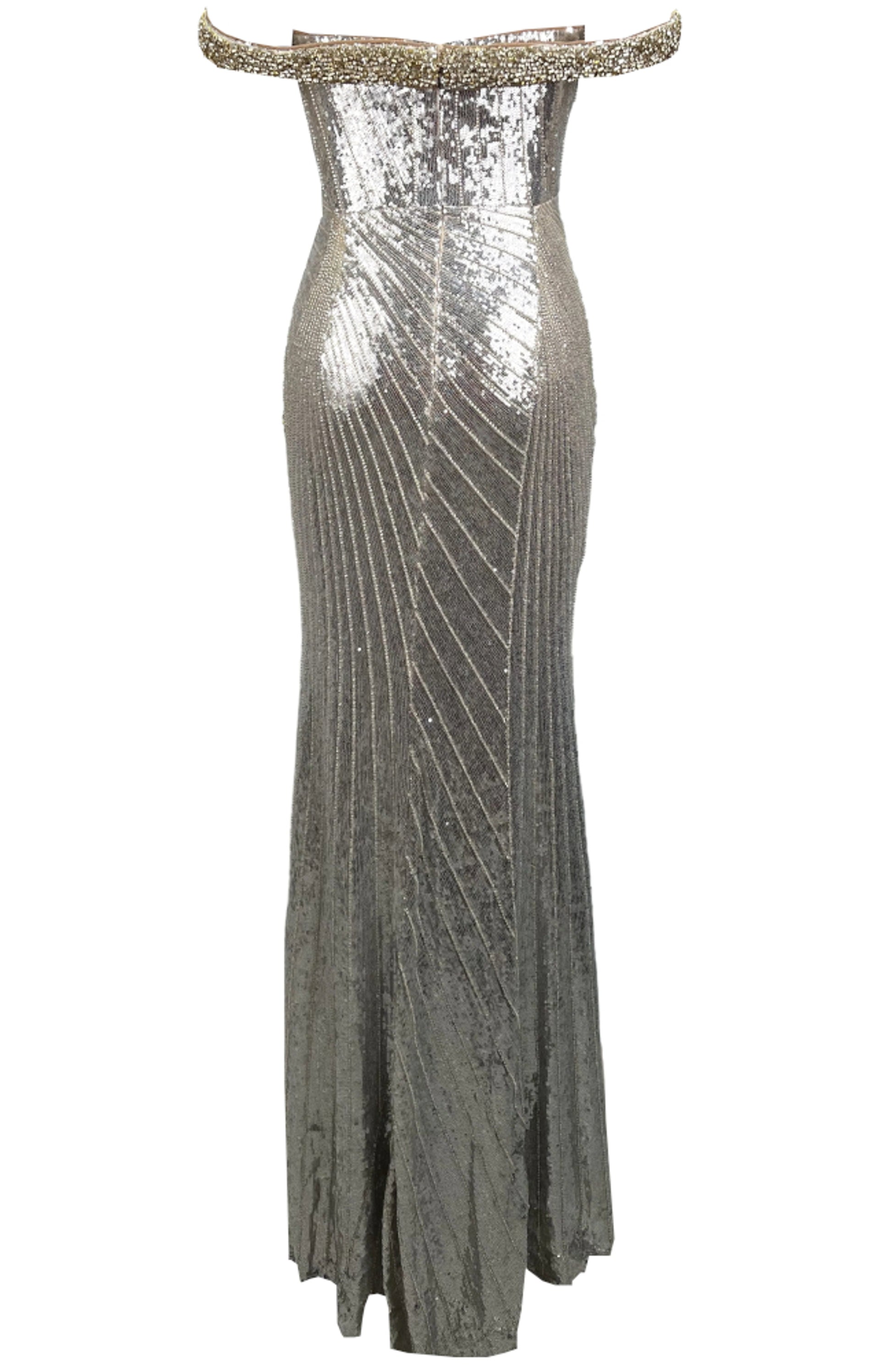 Othmar Embellished Bardot Sequin Maxi Dress In Platinum