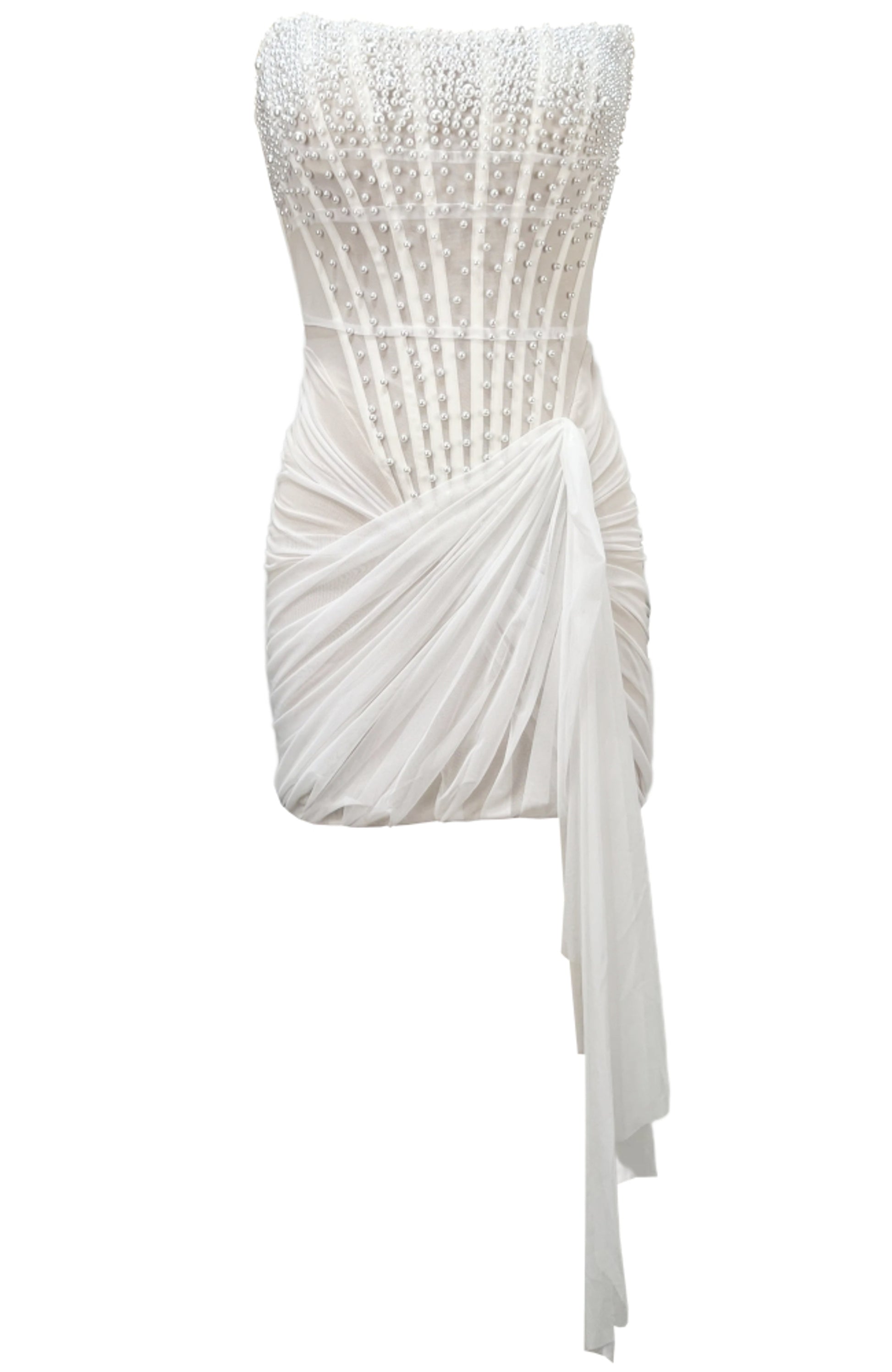 Ozvara Strapless Pearl Draped Corset Dress In White